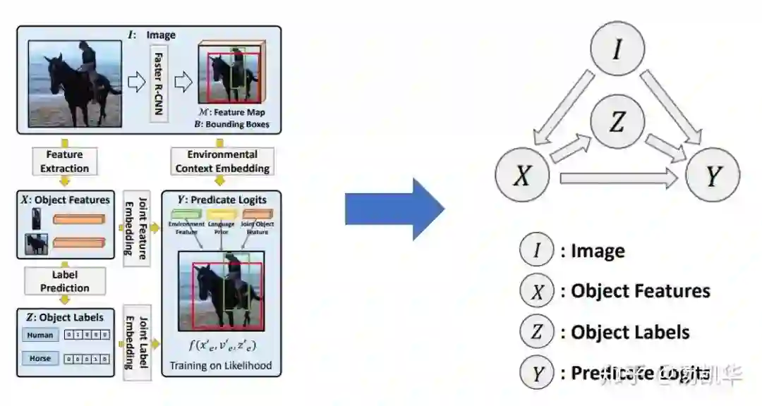 到了今年的CVPR,我们做了一个更大胆的构想。我们将常见的MOTIFS和VCTree等模型归纳为了如下的因果图。因果图中每个节点为一些关键变量,而其中的有向边就是对各种网络forward运算的简化,仅体现了一种因果上的决定关系。