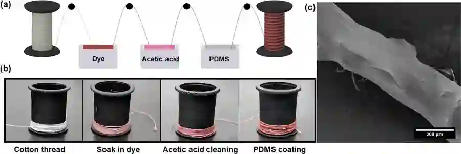 研究人员通过三个步骤的处理将染料“捕捉”到线中。首先,这种线被浸入染料中,然后用乙酸处理,使表面变粗糙并使纤维膨胀,这样会使染料与线之间产生更多的相互结合作用。最后,线会通过聚二甲硅氧烷(PDMS)处理,围绕着线和染料创造出一层柔性的物理密封,它也可防水以及防止染料在清洗期间被过滤掉。重要的是,PDMS 也是透气的,使得分析物可以接触到光学染料。