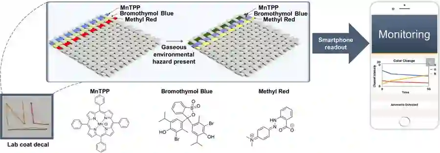 这项研究采用了一种基于锰的染料MnTPP、甲基红、溴麝香草酚蓝来论证这个概念。MnTPP和溴麝香草酚蓝可检测氨气,而甲基红可检测氯化氢,这些气体通常会在清洁用品、化肥、化学物质和材料生产时释放出来。
