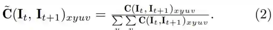 接下来,由于特征相关性体积在所有的空间位置上表征了参考帧与下采样相邻特征帧之间的一致性,本文对其 沿着最后两个维度 uv,基于他们的和(sum),做归一化。归一化的相关性体积计算公式如下所示: