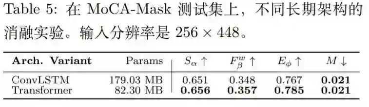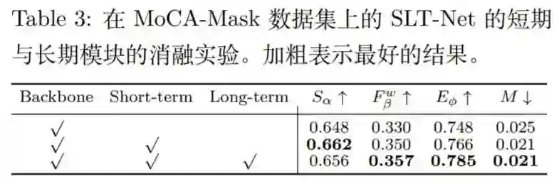 短期和长期模块:本文从两个方面来评估短期和长期模块的有效性。首先,如表3所示,本文在 MoCA-Mask 数据集上对短期和长期模块进行了消融实验。
