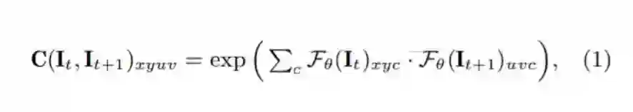 其中,c 是帧的特征通道维度的索引(index)。随着所有的相邻特征被相关性给配对起来,本文可以在全局尺度找出其一致性。为了降低计算复杂度,本文通过对特征进行最大池化(max-pooling)来下采样相邻帧, 并保持参考帧的分辨率不变。该设计帮助模型在保持高分辨率图像细节的同时,还能学习多尺度位移。