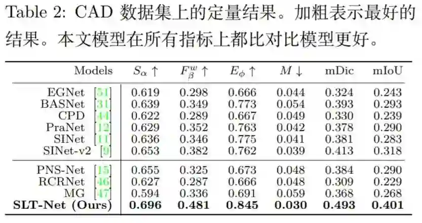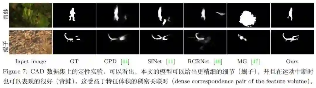 CAD 数据集上的性能:如表2所示,本文评估了不同方法在 CAD 数据集上的跨数据集的泛化性。本文的方法再次在所有 6 个评测指标上优于对比方法。进一步展现出本文方法的鲁棒性。如图7所示,本文的方法可以得到更加清晰的边界与更细粒度的可视化细节。这受益于模型在特征空间所构建的像素级相关性对。