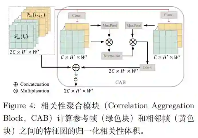 如图4所示, 本文给出了相关性金字塔的核心单元,相关性聚合模块 (Correlation Aggregation Block, CAB ) C。给定一个视频帧特征对 相关性体积定义如下
