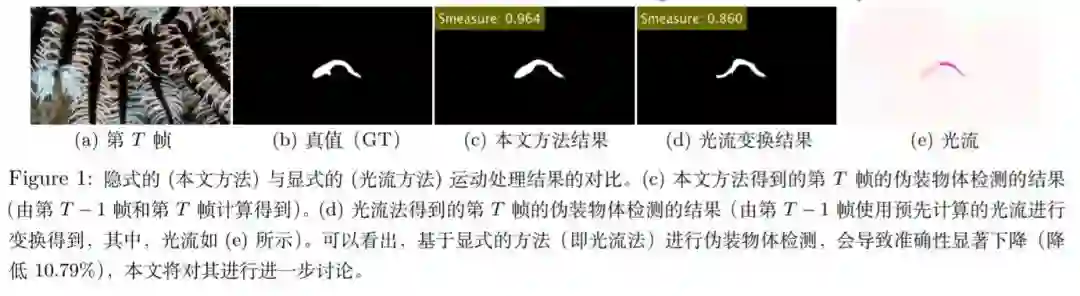 2) 物体通常有与环境相似的、重复的纹理。因此,想要通过帧间像素点的移动来估计运动(正如光流法所实现的),将难以预测且容易出错。考虑到第一个难点,要想解决 VCOD 任务,神经网络需要在运动信息的帮助下,有效地发现伪装物体与背景之间存在的细微差别。