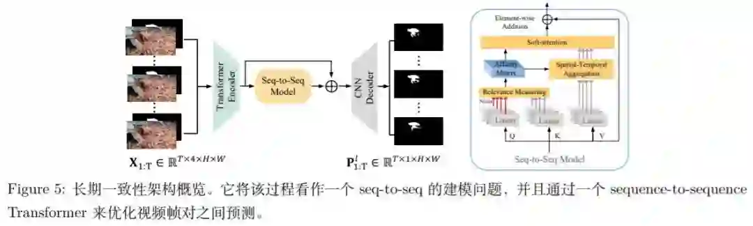 虽然相关性金字塔策略可以有效地捕捉运动,实现伪装物体检测。但是,由于它的计算复杂性高,无法方便地扩展到长视频序列中。为了解决这个问题,本文采用一个包含时空 Transformer 的 sequence-to-sequence 架构,通过长期一致性来优化并预测视频中连续帧。本文发现该架构相比标准的 ConvLSTM 模型 [45, 54],能得到更准确的预测结果。