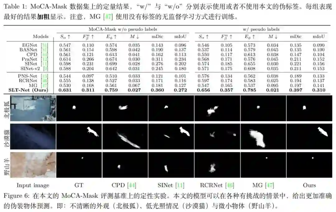 MoCA-Mask 数据集上的性能:如表1所示,本文的方法明显优于对比方法。其中,在 S_α 指标上以 9.88% 的差距,超过当前最好的对比模型 RCRNet [46],在 指标上以 92.97% 超过了 SINet [11] 模型。如图6, 给出本文的方法与基准模型的定性对比。本文的模型可以在很多有挑战性的情况(例如物体有纤细的躯干 或复杂的外观纹理、模糊或者突变运动)中,更加准确地定位与分割伪装物体。