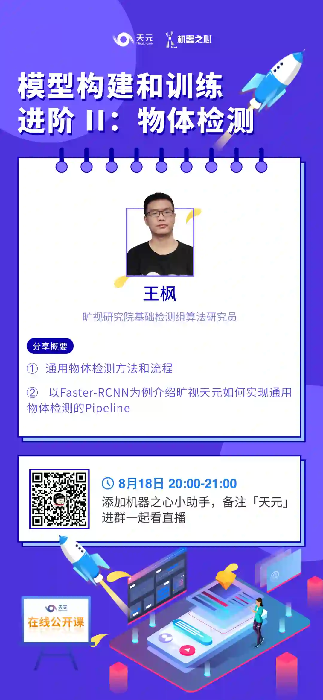 分享概要:本节课程中,我们将学习通用物体检测的方法和流程,并且我们将以Faster-RCNN为例讲述旷视天元MegEngine是如何实现通用物体检测的Pipeline的。其中包括数据准备,模型搭建,训练测试,还有节省显存的大杀器sublinear memory等内容。
