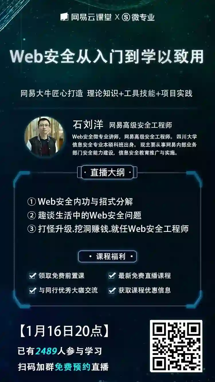 为了让大家更进一步了解Web安全的学习路径以及企业对安全人才的实际需求,1月16日晚上20点,我们邀请到网易高级安全工程师石刘洋在网易云课堂进行一场主题为《Web安全从入门到学以致用》的免费的直播分享。