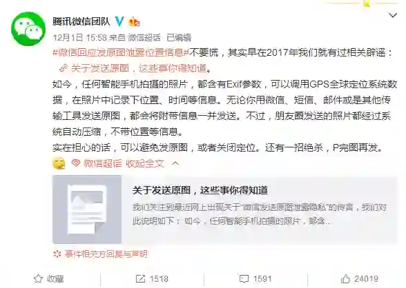 对此,腾讯微信团队发声明称不要慌,并表示早在 2017 年就有过相关辟谣:朋友圈发送的照片都经过系统自动压缩,不带位置等信息!实在担心的话,可以避免发原图,或者关闭定位——还有一招绝杀,P 完图再发。