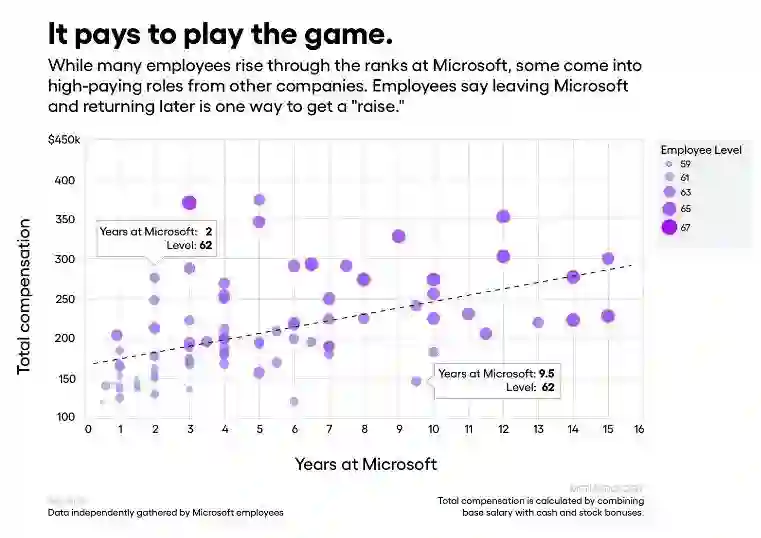 另外如果想要获得更高的工资,一个相当常见的策略是,离开微软,到另一家西雅图公司工作,比如亚马逊(Amazon),甚至是一家初创公司,然后再回到微软,就可以跳到更高的职位。虽然这些数据没有追踪到微软中如此惯用的行为,但显示了一种趋势是,微软一些较低职级经验的人确实跳级到了更高的职级。