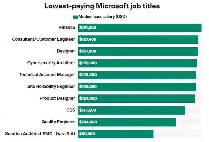 薪资最低的岗位中, 数据和人工智能解决方案架构师排名最后,只有八万美元,其他还有工程师、产品设计等等工资也相对来说很低。
