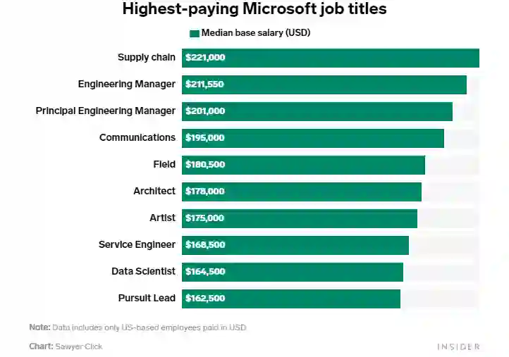从表格中可以看到数据科学家的工资虽然高,但也只是勉强进入前十,高薪者大多是掌握一定资源的人,例如供应链、管理人员。