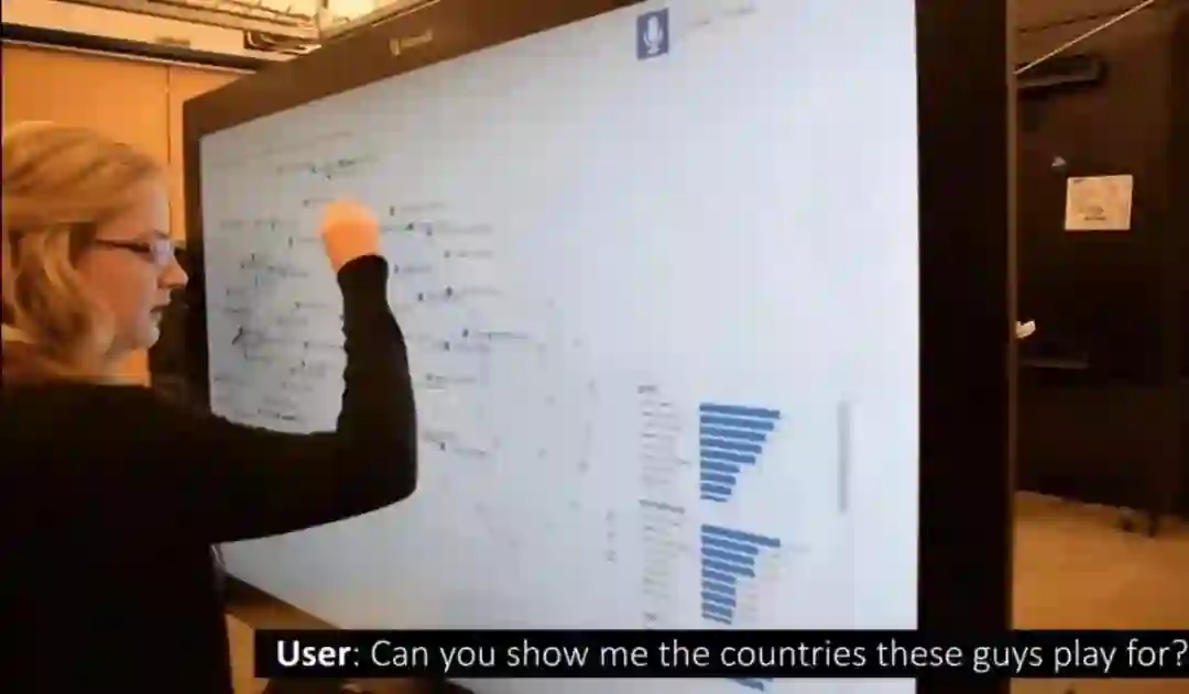接下来,Stasko教授又针对“为什么仅仅是触摸呢?”问题,进而引出自己关于更多样的交互方式的研究成果。Stasko教授首先提出了使用讲话和自然语言交互的可能性。但用户对于可视化系统的需求不同,也存在需求相同但表达方式不同情况的存在,那么用户会对可视化系统说些什么呢?Stasko教授团队在项目初期仅仅针对某一特定领域的数据。为了保证触摸交互可用的情况下,再引入语言交互以增加交互的多样性,Stasko教授团队在初期以欧洲足球运动员数据集为数据集,开发了名为“Orko”的程序,如图3。后来,Stasko教授团队又对更广泛的领域展开了研究,对用户的指令提出了一种“话语框架”的方法,将用户指令划分为可视化相关、数据相关和系统控制相关,以此来扩展到更广泛的领域。