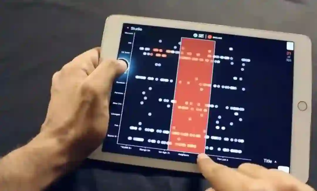 首先,Stasko教授针对“我们如何将数据可视化引入平板电脑?”一问展开研究回顾。在对这一问题的研究中,Stasko教授指出,将数据可视化引入平板电脑中面临着诸如小视觉元素的选择、“胖手指”问题、缺少键盘输入和缺少鼠标悬停等问题。如图1,针对这些问题,Stasko教授团队开发了一款名为“Tangere”的应用程序,来将传统的图表信息可视化带入平板电脑中。如图2,实际应用过程中,为了达到和台式机配合鼠标键盘交互一致的便利性,Stasko教授又引入了“Clutch”方法来解决平板电脑中缺少Shift和Control键的不便。最后,Stasko教授也从可探索性、工具性和易用易学性验证了这种方法的可行性。