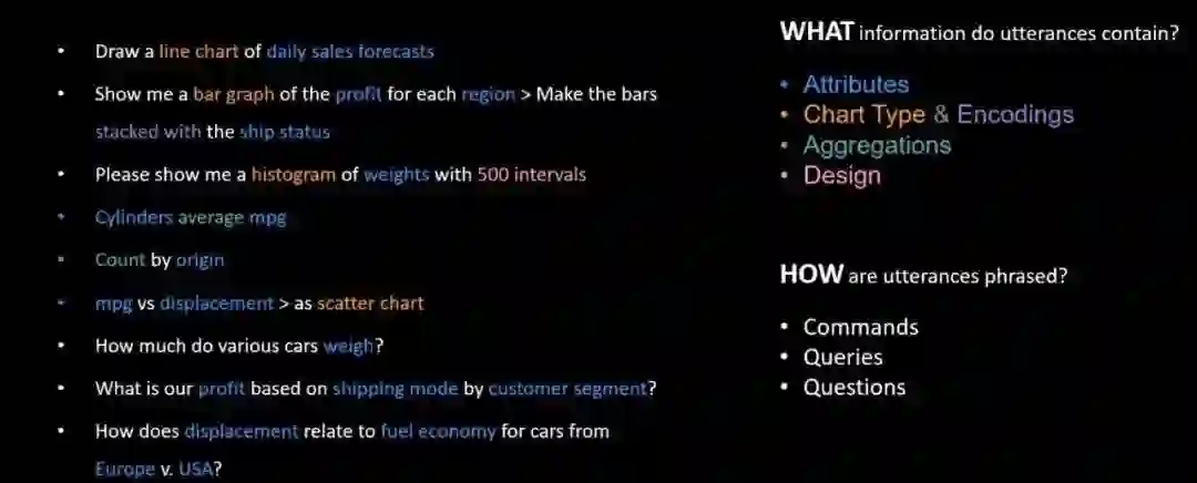 再者,Stasko教授就“人们通常会使用什么样的指令来指定数据可视化?”问题介绍了他的团队在过去的工作。Stasko教授团队做了广泛的在线测试,并收集了大量的数据,并详细分析了语句的特征,并据此进行了分类以便更好的识别指令的信息,如图8所示。