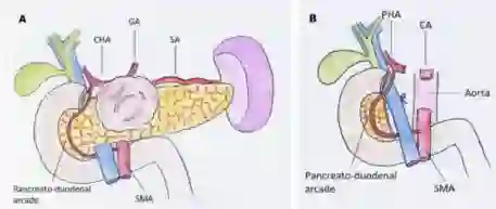 鉴于较高的术后并发症和死亡率,生存是否优于姑息治疗亦不明确,因此胰腺联合动脉切除(AR),如SMA、腹腔动脉(CA)或肝动脉(HA),并非标准治疗,不常规进行,但AR可用于临床研究。