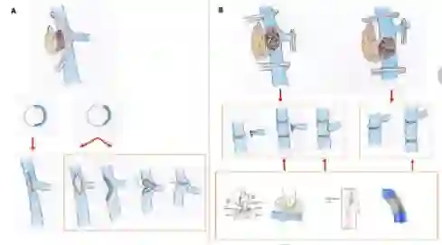 图2. 2A :肠系膜上静脉-门脉轴部分切除,若<50%血管环周,切除后缝合;>50%血管环周时切除,采用补片或横向折叠缝合。2B:肠系膜上静脉-门脉轴完全切除重建,根据肿瘤部位和静脉融合侵犯程度有不同的重建模式:断端直接缝合或植入物后缝合。