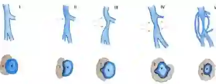 图1.血管肿瘤轴状接触面和肠系膜上静脉-门脉轴冠状面的不规则改变。I:肿瘤接触面<180°;II:肿瘤接触面<180°,过渡平滑;III: 肿瘤接触面<180°,单侧狭窄;IV: 肿瘤接触面>180°,双侧狭窄;V: 肿瘤接触面>180°,双侧狭窄与血管并行。I型可切除,II-IV型边界可切除,V型不可切除。