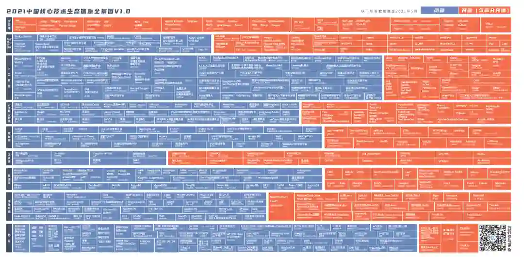 在这一趋势下,国产 IT 基础设施已经有了哪些产品?从中国核心技术生态体系全景图中我们可以一窥。这其中,开源的比重正在逐渐增加。