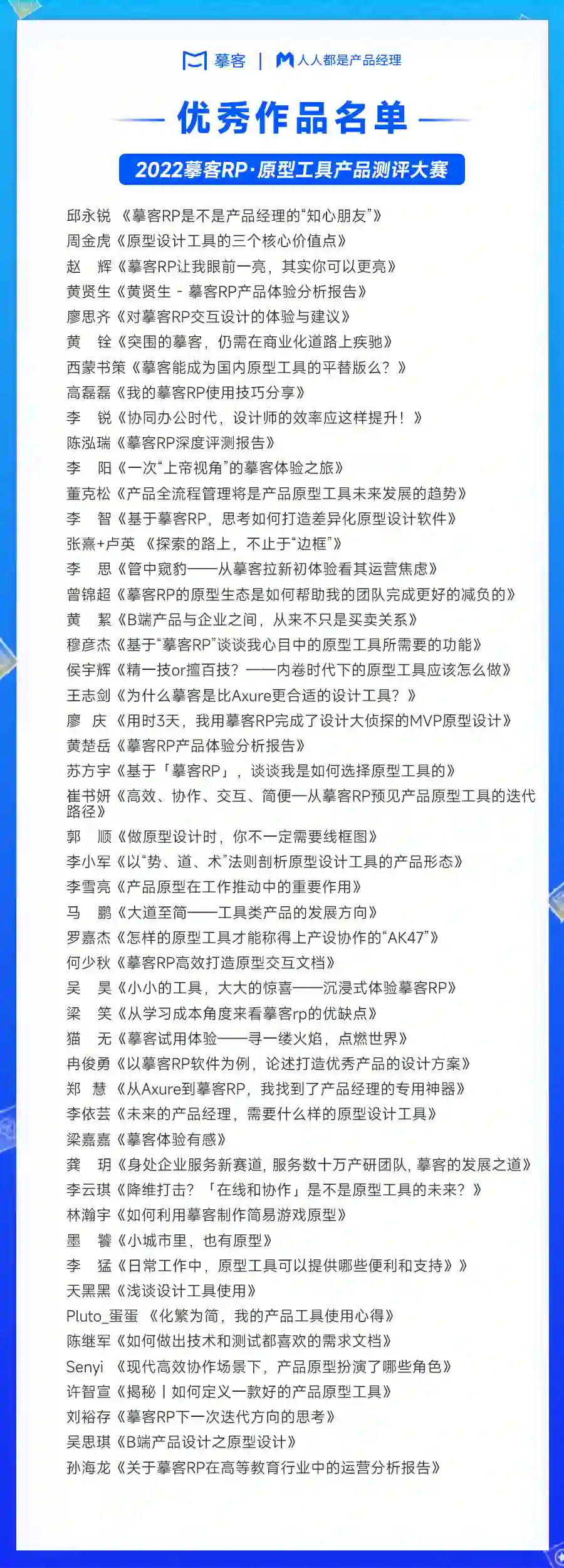 本次大赛的全部参赛作品由三方——摹客官方专家团队、大赛专家评审团队、人人都是产品经理媒体团队,经过多轮严谨考核与评审,最终统计得出以下56篇获奖作品: