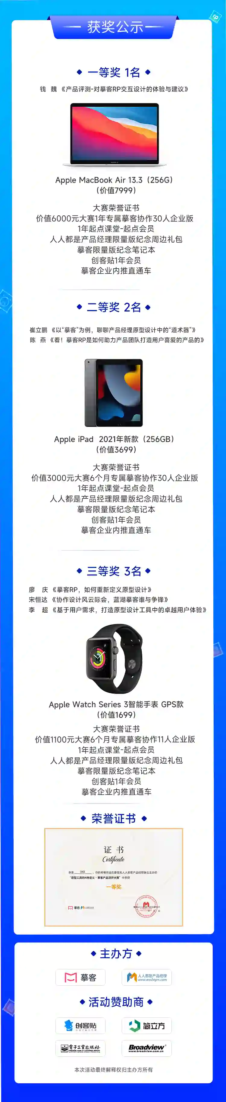 除此之外,部分优秀作品将会在获得摹客官方媒体、人人都是产品经理社区网站首页及其他优质渠道发布。
