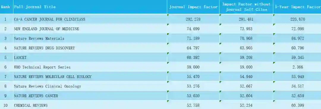 在CVer后台回复:影响因子,即可下载所有SCI论文的影响因子的汇总表格,排名前十的期刊表格数据如下: