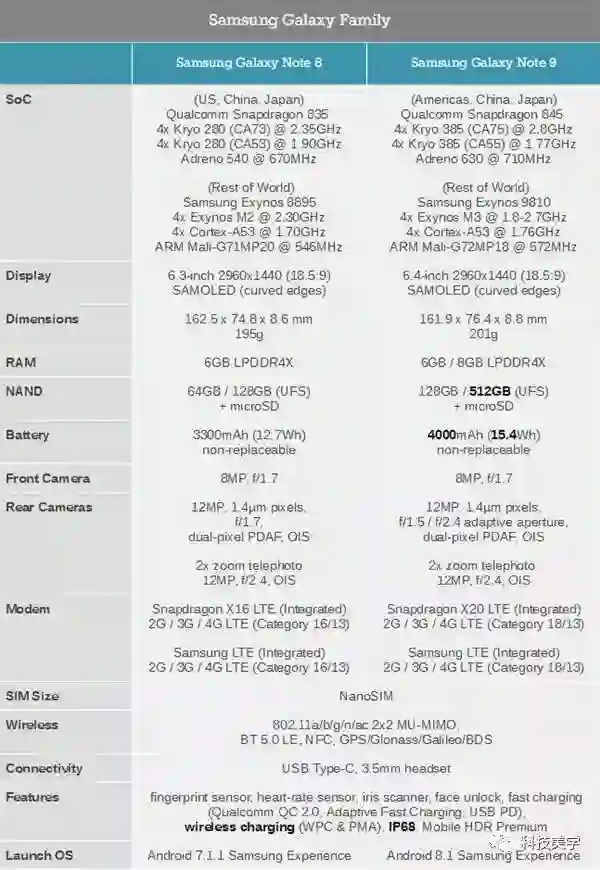 三星也按照惯例制作了一份信息图解,简单明了地对比了Note 9、Note 8的主要规格。可以看出Note 9的主要变化有: