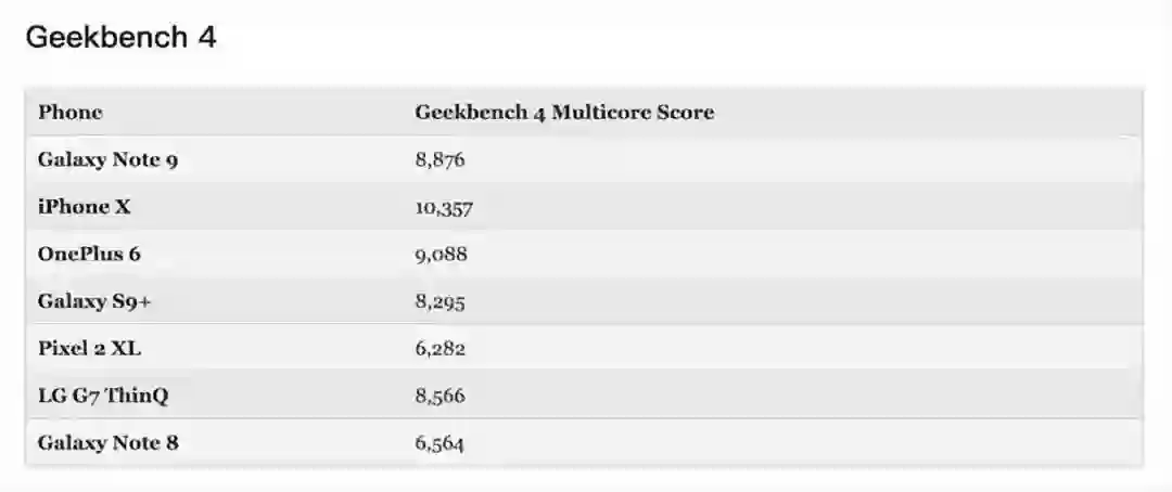 Tom 's Guide测试的机型为6GB的入门级Note9。在Geekbench 4测试中,iPhone X的得分为10357,超过了其他所有设备。相比之下,Galaxy Note 9的成绩为8876,一加6为9088分。