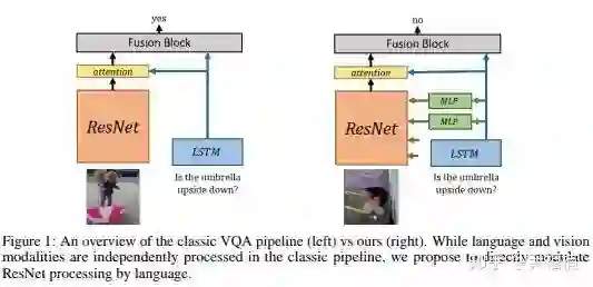 上图左侧为传统的 VQA 系统,我们发现,LSTM 提取的特征只在 ResNet 的顶层才和图片特征结合起来,因为通常意义上讲,神经网络的底层提取的是基础的几何特征,顶层是有具体含义的语义特征,因此,应该把语言模型提取的句子特征在网络顶层和图片特征结合。然而,作者认为,底层的图片特征也应该结合语言特征。理由是,神经科学证明:语言会帮助图片识别。例如,如果事先告诉一个人关于图片的内容,然后再让他看图片,那么这个人识别图片的速度会大大加快。因此,作者首创了将图片底层信息和语言信息结合的模型,如上图右侧所示。
