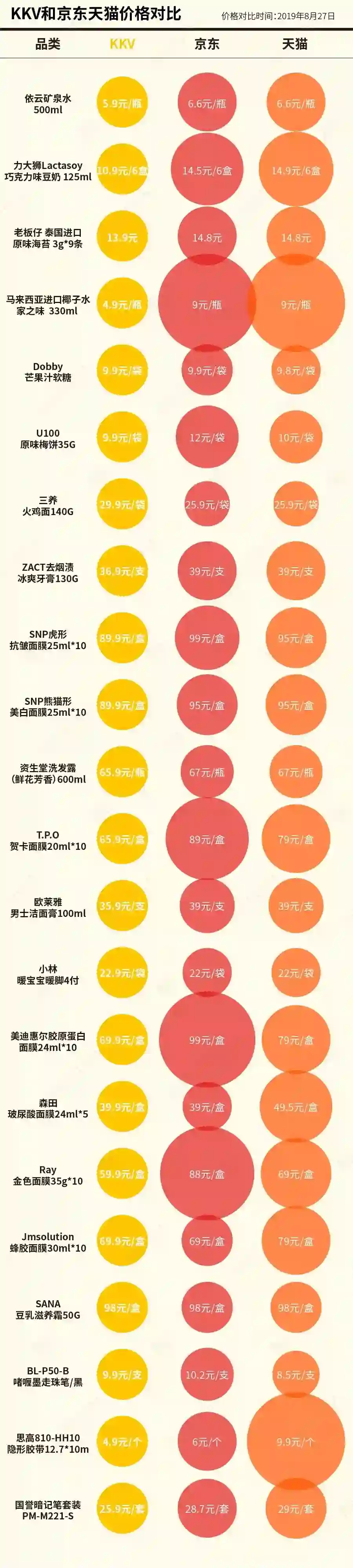 新经济100人抽样对比了KKV、京东、天猫的商品价格,抽样选取同规格、同种类的商品。结果如下图所示: