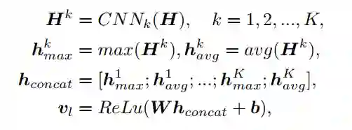 在此基础上,考虑到 BERT 关注的更多的全局信息,对一些局部特征的建模还有所欠缺,作者在这里使用了 CNN 进行局部特征抽取,通过利用不同尺寸的卷积核实现更全面的局部特征抽取: