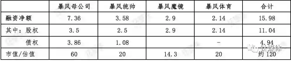 暴风母公司融资额度:暴风在2015年3月24日创业板上市时募集资金1.66亿元(根据公开报道),以及分别在2015年5月、2016年4月进行的共计1.84亿元股权激励(2017年半年报披露),总计为3.5亿元的股权融资。