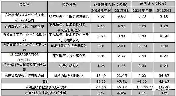有媒体将去年乐视年报中应收账款前七大关联方列出,再与今年上半年的数据进行比较。数据显示,这7家关联方的合计应收账款余额为45.71亿元,占应收账款的总额48%。而截至2016年12月31日,该占比为37%。