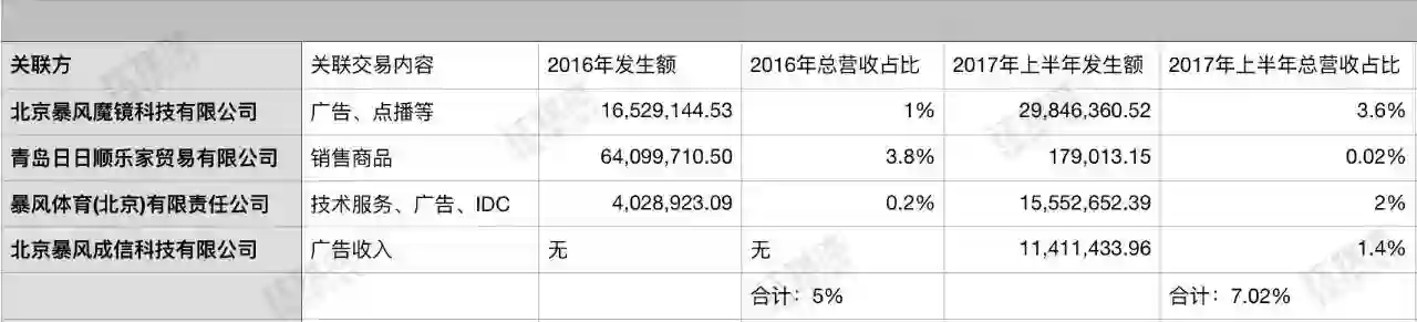 而相比乐视琳琅满目的关联交易类目,暴风集团的关联交易相对倒是简单很多,以下是钛媒体记者在暴风集团2016年年报以及2017年半年报中摘录的部分数额较大的类目,2016年占比5%左右,2017年上半年关联交易占比为7%左右: