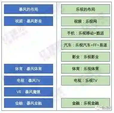2、相似的业务布局。从2013年开始,乐视开始将旗下业务由视频延伸至影视、电视、手机、汽车、体育、金融……,同时著以“乐视生态”一词,无所不包的将乐视网与其他子公司在品牌上形成统一;而暴风则在2016年年初抛出“联邦”概念,通过“全球DT大娱乐布局”,围绕VR、体育、影业、TV等业务形成“多中心布局”。