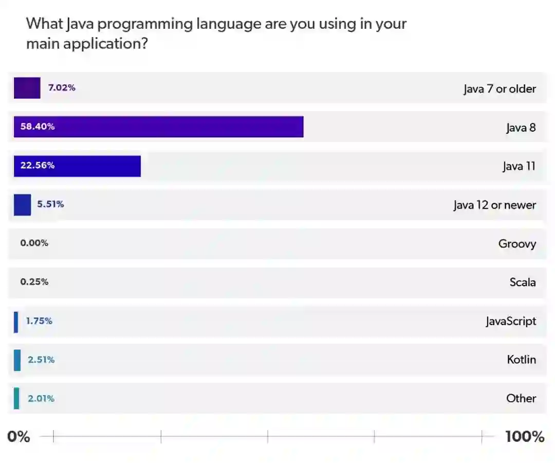 58%的受访者表示,他们在主要应用程序中选择使用Java 8作为编程语言。其次是Java 11,占受访者的23%。之所这两个版本比较受欢迎,很大程度是因为他们是Oracle宣布长期支持的两个版本。