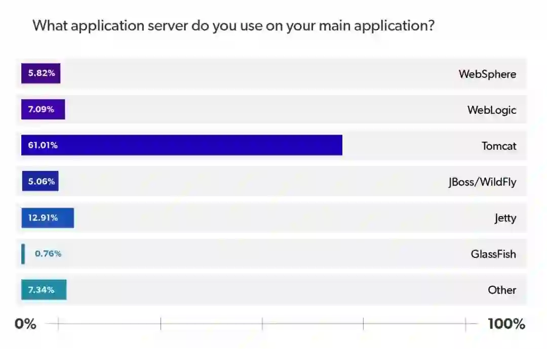 调查结果显示,有超过半数的开发者们使用的主要的应用服务器还是Tomcat,占比61%,是第二名Jetty的5倍。