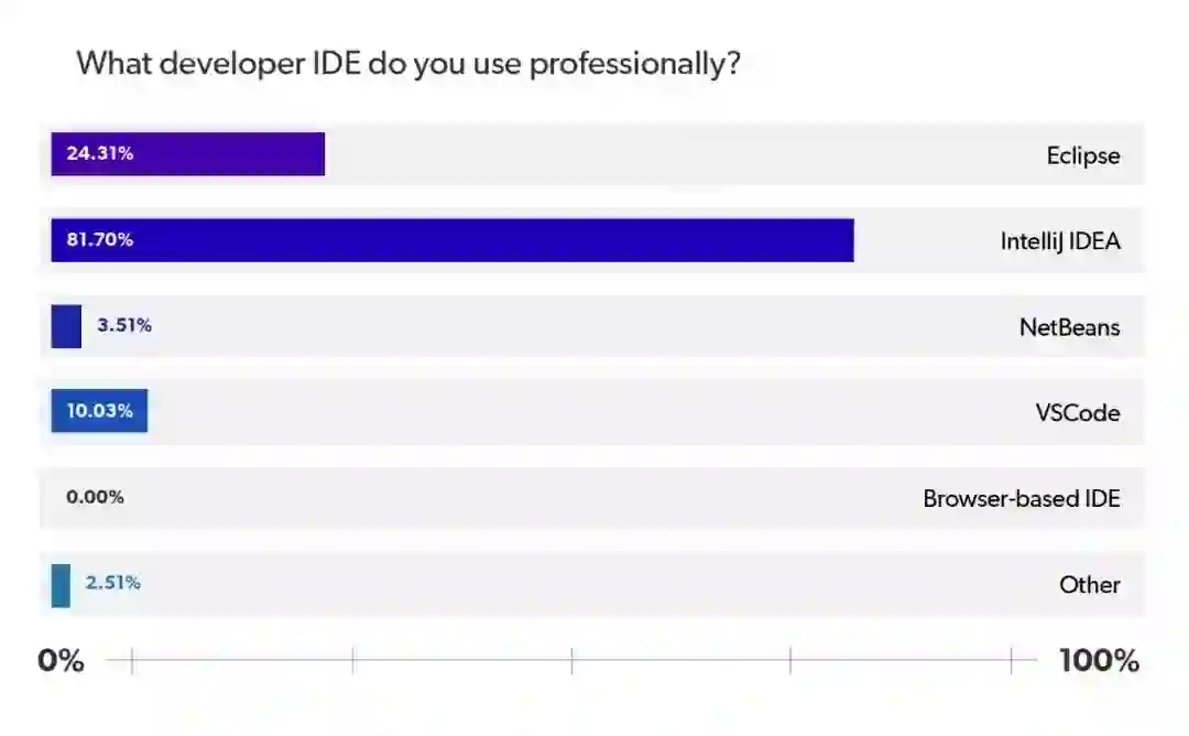 在使用的IDE方面,82%的受访者使用IntelliJ IDEA,很明显,这个付费IDE非常值得一试,当然社区版也是很不错的。