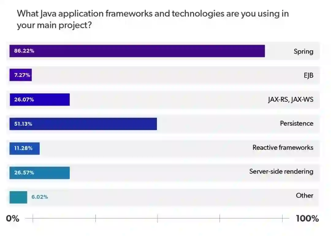 86%的受访者使用Spring, 51%的受访者使用Hibernate、OpenJPA或EclipseLink等持久化技术。27%的报告使用了服务器端呈现技术,如JSP、JSF、Thymeleaf、FreeMarker或GWT。