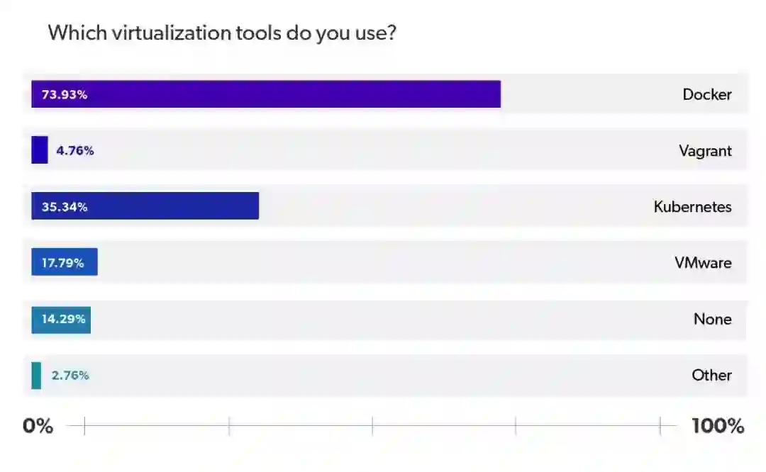 最常用的工具是Docker,占74%。Kubernetes是第二大最受欢迎的虚拟化工具,占35%,这显示了Kubernetes在过去几年的持续增长。
