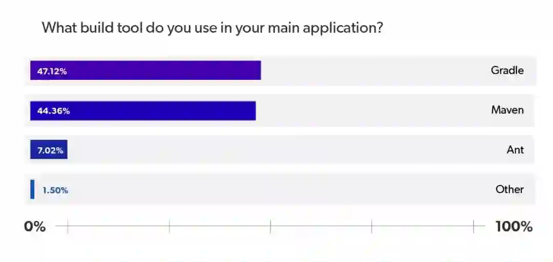 调查发现,47%的受访者使用Gradle作为其主要应用程序的构建工具,44%的受访者使用Maven。