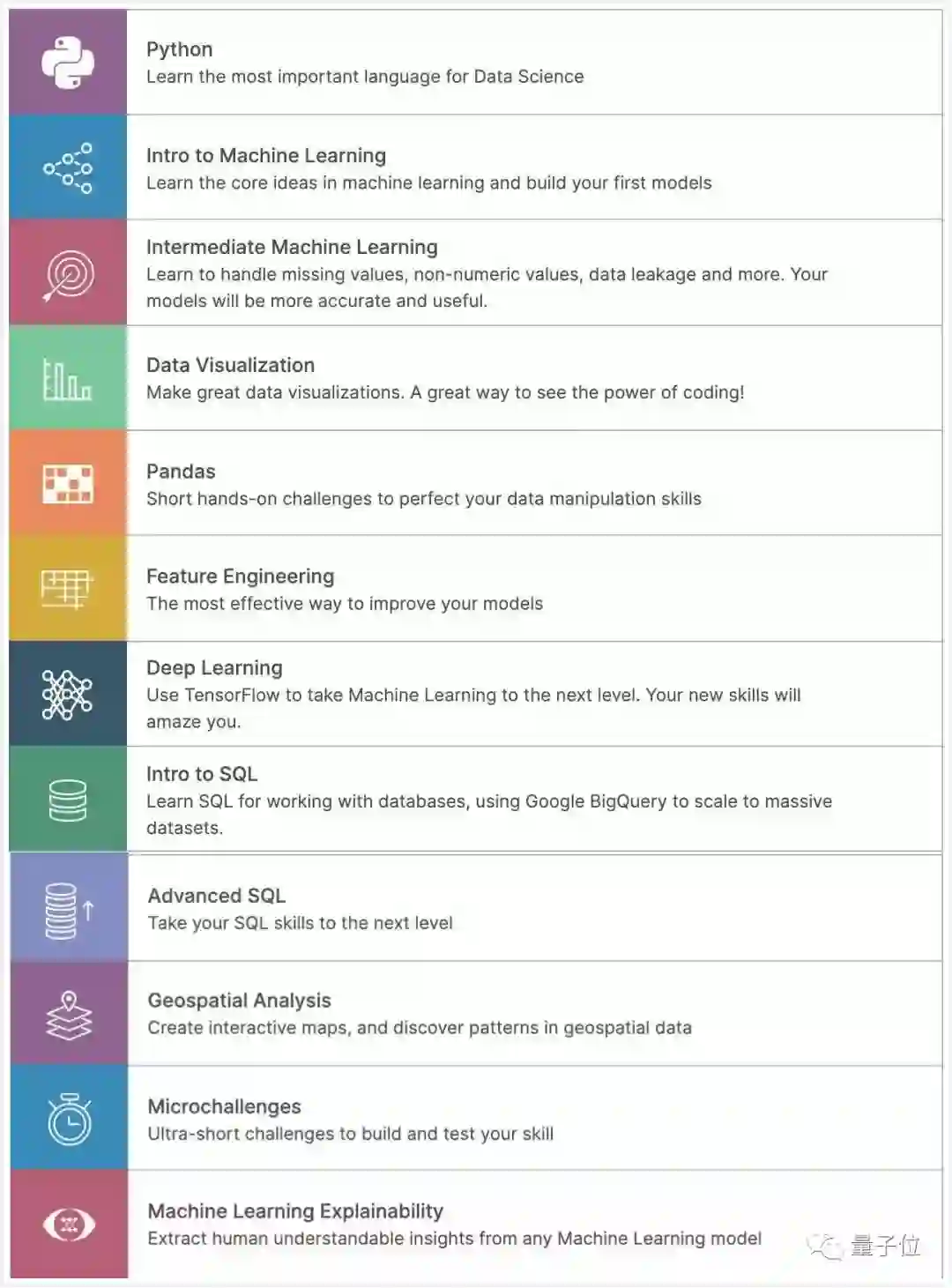 Python,机器学习入门,中极机器学习,数据可视化,Pandas,特征学习,深度学习,SQL入门,SQL进阶,地理空间分析,机器学习可解释性。