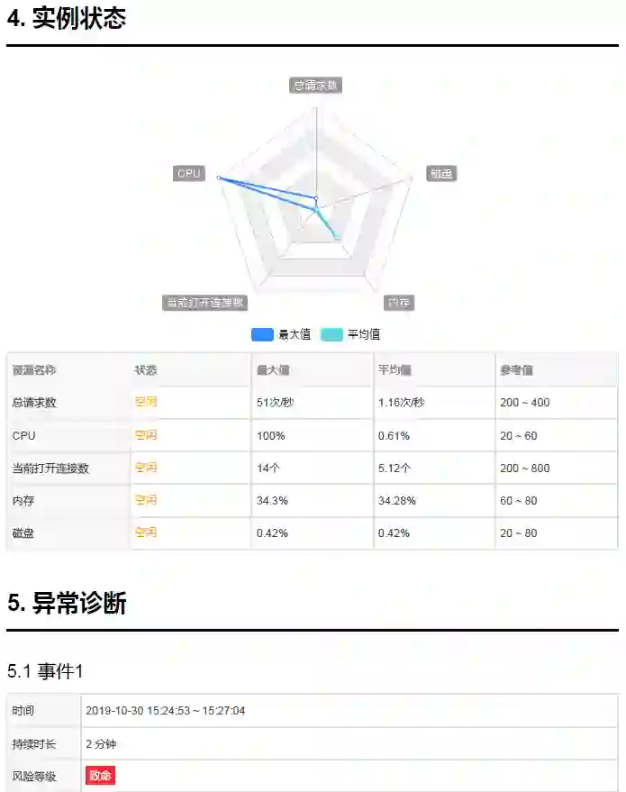 数据库健康状况打分。将数据库的核心监控指标(例如活跃连接数、CPU、内存、磁盘等)纳入到评分模型中,同时也将结合数据库的历史异常率,慢日志、死锁、审计日志等深层次分析找出潜在问题,综合给数据库的健康状况进行打分。
