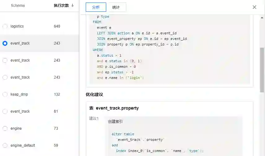 针对聚合后的 SQL 语句,根据其执行计划的结果,综合分析资源消耗、扫描和返回集合大小、索引使用合理性等,对 SQL 的性能进行分析,并针对低质量 SQL 结合索引情况、库表设计,给出优化建议。