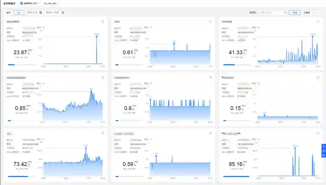 在应对流量洪峰的保障中,传统的监控很难提供一个关注所有数据库实时状态的全局视野。DBbrain 针对这一行业痛点,为用户提供了“全实例监控”、“全实例概览”,实现以全数据库实例维度(用户整体视角)的监控指标展示。统一监控视图里展示所有实例(9 宫格和 36 宫格切换)监控指标的横向视图,便于用户查看和发现数据库异常问题,提高运维效率。