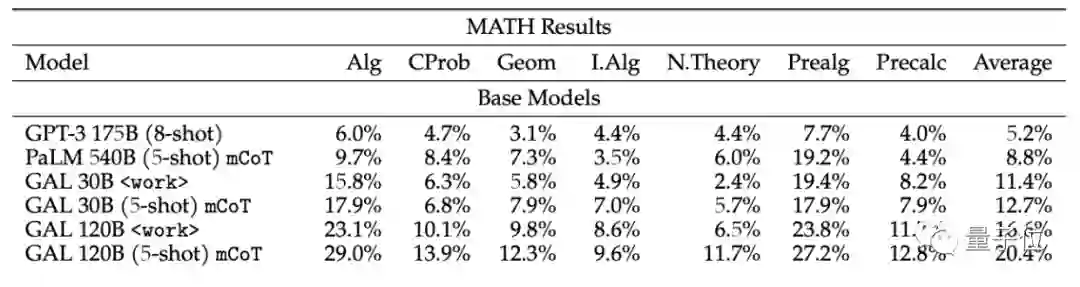 推理方面,GAL的优势脱颖而出,在数学MMLU(大规模多任务语言理解)上,表现要优于Chinchilla,数学方面,表现也优于PalM 540B和GPT-3 175B。