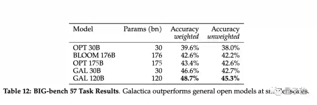 尽管,GAL并没有经过一般数据集的训练,但它在BIG-bench上的表现仍旧优于BLOOM和OPT-175B。