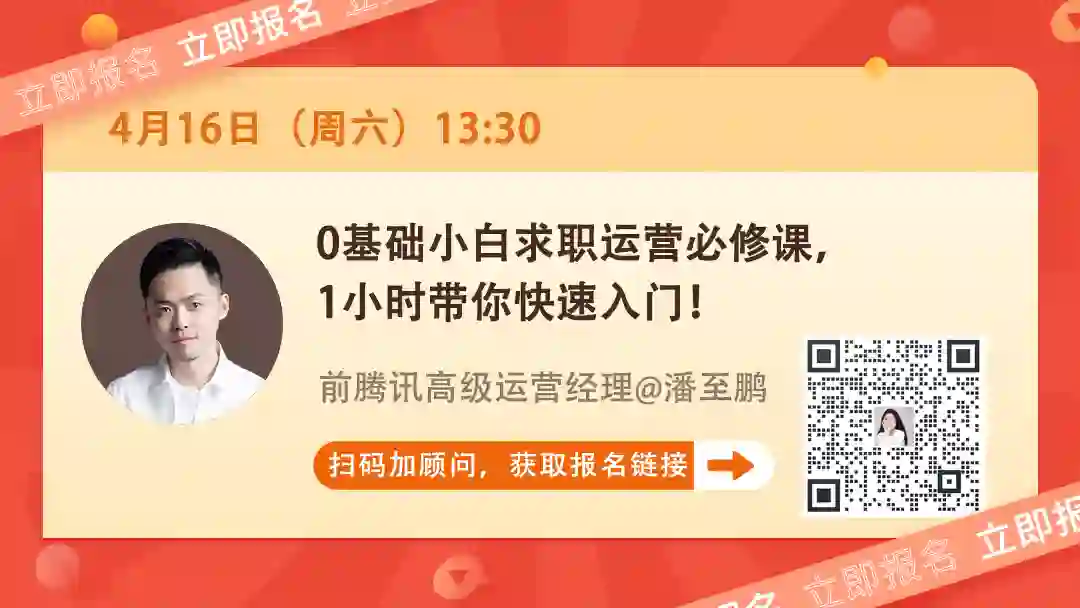 4月16日(周六)13:30,前腾讯高级运营经理@潘至鹏老师,为广大想入门运营的小白,开展一期免费公开课,在线直播讲解少走弯路、快速入门的方法!
