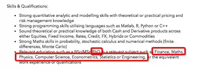 曾有一位华尔街量化大佬表示:“如果你没有计算金融、物理、工程或者统计等等偏Quant的硕士或者博士学位 ,几乎是不可能在顶级quant trading公司找到工作。”
